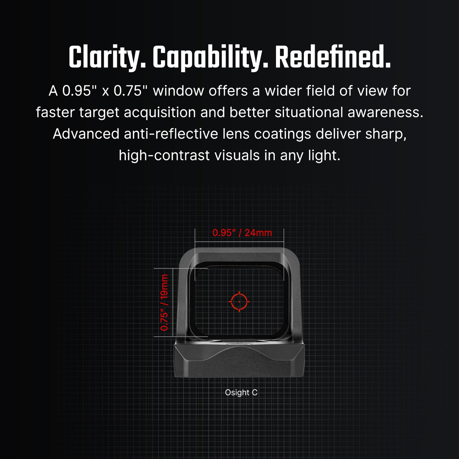 Osight C coloca clareza, velocidade e confiança no centro de cada disparo. Uma janela de visualização brilhante e ampla acelera sua imagem de visão para que os alvos apareçam instantaneamente. Troque retículos para corresponder ao momento—desde precisão apertada até transições rápidas—enquanto um sensor de movimento inteligente mantém o optic ready quando você está e economiza energia quando você não está. Trocas de bateria são fáceis e não perturbam seu zero. E graças ao seu padrão de montagem padrão da indústria, o Osight C se adapta a uma vasta gama de pistolas e armas longas sem drama.