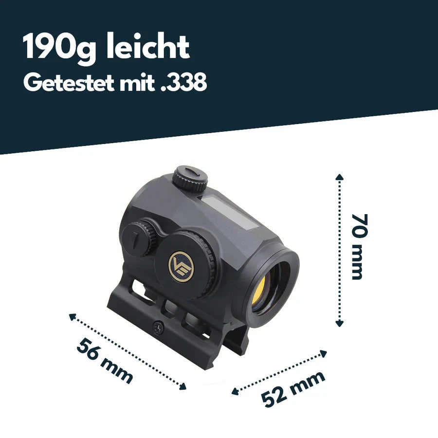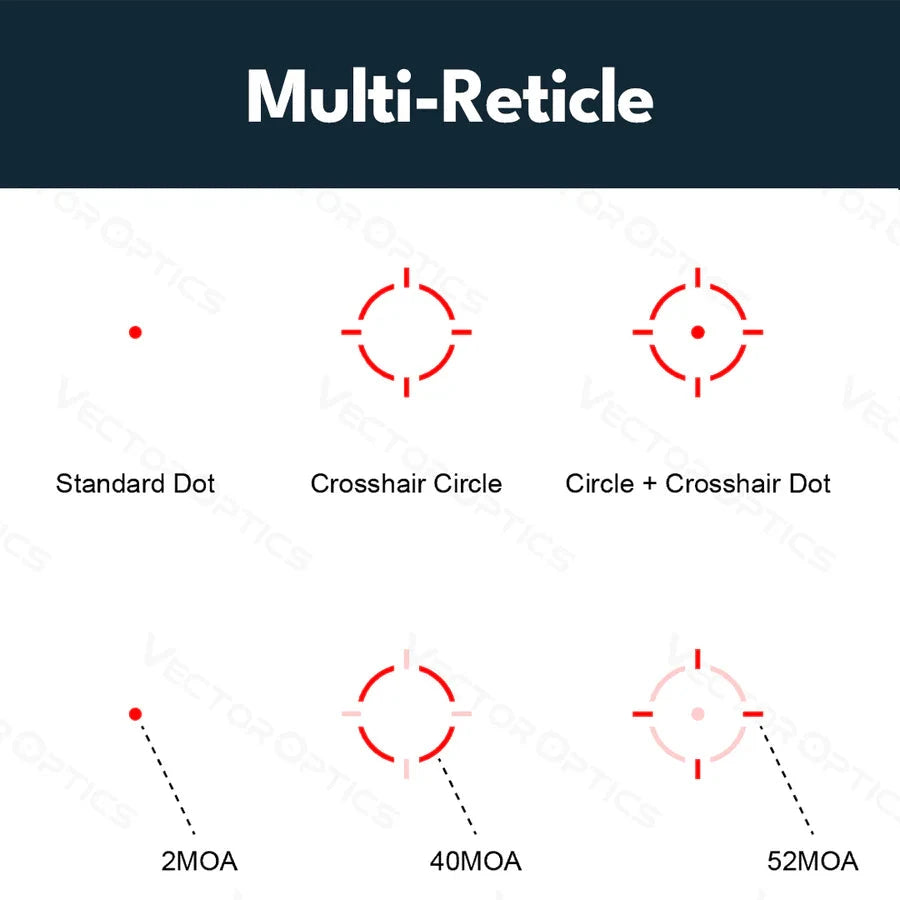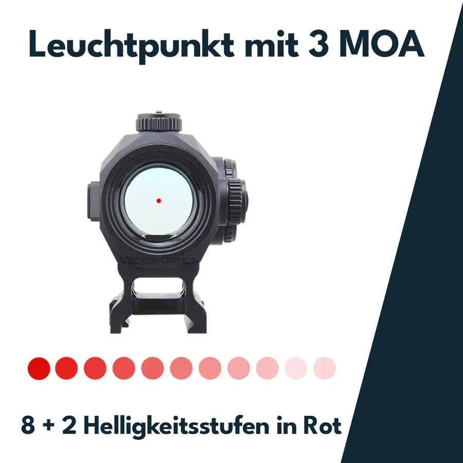 Também oferece três retículos selecionáveis, um sensor de movimento (desliga automaticamente após 2 minutos de inatividade e volta a ligar-se assim que a ótica é movimentada) e um total de dez níveis de luminosidade (incluindo 2 níveis para visão noturna).